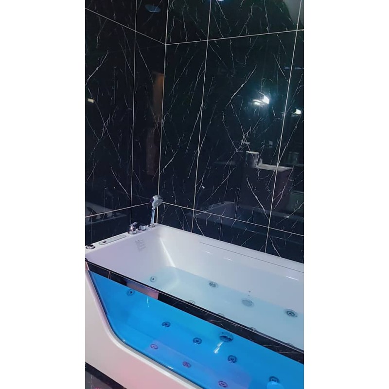 Chambre spacieuse avec placard et écran, cuisine américaine, douche avec jacuzzi, salon avec salle a manger